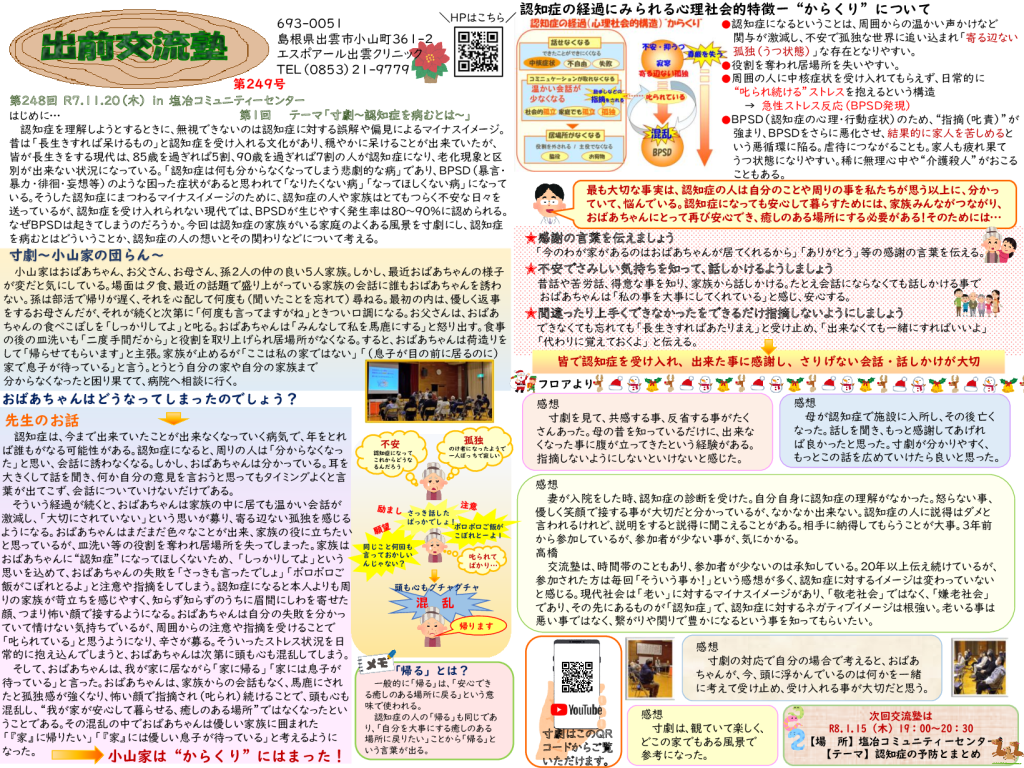塩冶コミュニティセンターで行われた認知症出前交流塾のレターを掲載します。